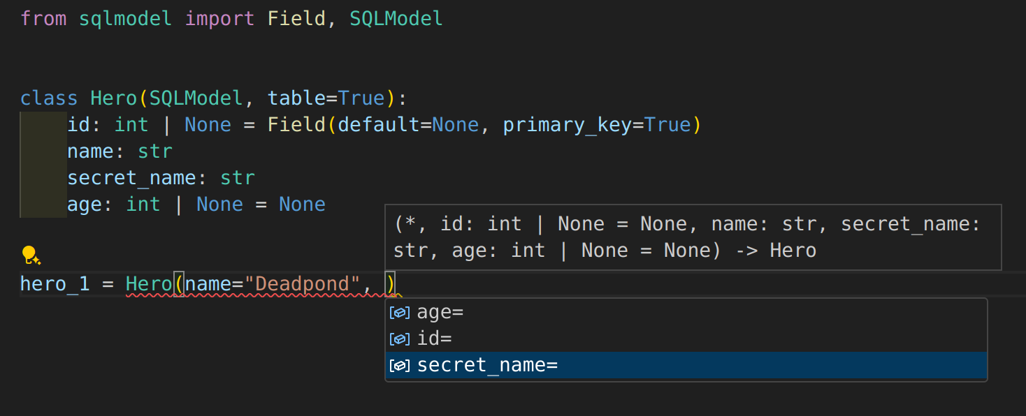 SQLModel adopts PEP 681 for Python type annotations to ensure the best developer experience, so you will get inline errors and autocompletion even while creating new model instances.